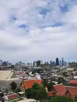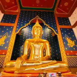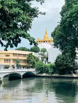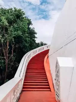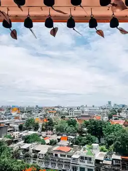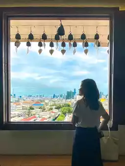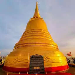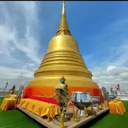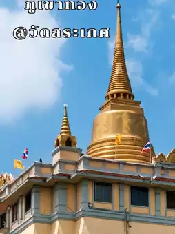 Phu Khao Thong, or "Phra Borom Bupphot," is located at Wat Saket Ratcha Wora Maha Wihan in Pom Prap Sattru Phai district, Bangkok. The highlight is the large golden chedi situated on a 77-meter-high hill, with a spiral staircase to climb. If you visit during the summer or late morning to noon when the sun is still up, we recommend bringing an umbrella and a hat. But once you reach the top of the golden chedi, you will feel the cool breeze and enjoy a beautiful 360-degree city view. We suggest coming in the evening because you can see the sunlight reflecting off the golden chedi, and it’s not too hot.