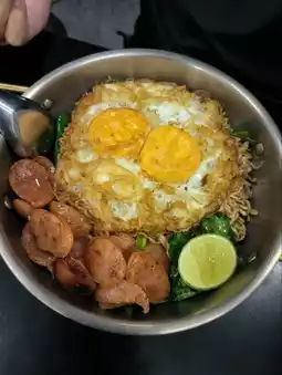 This instant noodle dish comes with two fried eggs, and you can choose the doneness. We chose well-done. It includes Chinese sausage and lime to squeeze. The taste is like instant noodles with seasoning powder, deliciously traditional just like when I was a kid buying it in front of the school, no difference.