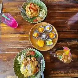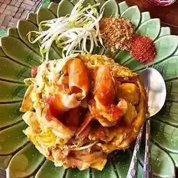 Traditional Pad Thai stir-fried using tamarind sauce. This shop roasts its own chili and peanuts, stir-frying one pan at a time. The noodles are chewy and soft with a balanced flavor. The shop also offers Thai desserts. The atmosphere is in a nearly 100-year-old wooden house by Klong Bang Luang at the Klong Bang Luang Floating Market in the Thonburi area. The shop is open from 11:00 AM to 5:00 PM.