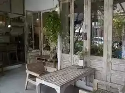 As you drive into Soi 48, look to your left for a low wooden fence and a faded wooden sign reading “Wood Café” hanging under the eaves. Small hanging plants and a wooden table in front of the café will guide you.