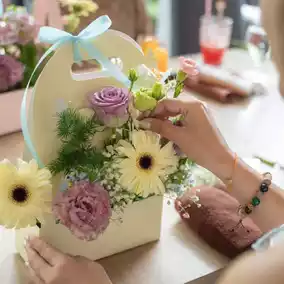 Today's theme is Korean-style flower arrangements, with soft tones. It's easy to arrange, perfect for beginners like us. Some people come with their moms, or we finish it and surprise them at home. The two hours went by so fast! It was fun, filling, and we took beautiful things home with us, bringing smiles to the recipient.