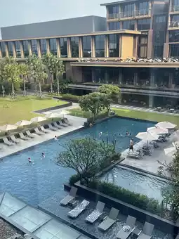 Another highlight is the large outdoor pool and 24-hour fitness center, a rare find in most hotels. Perfect for both fitness enthusiasts and those looking for a relaxing late-night swim.