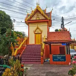 🏠 The Thai-style ordination hall (Ubosot), built in 1976, featuring a three-tiered tiled roof, decorative gables, and crown-shaped doors and windows inspired by Ayutthaya art. The hall is surrounded by a walkway and a sacred boundary wall. Inside, the principal Buddha statue is a Sukhothai-era sculpture.