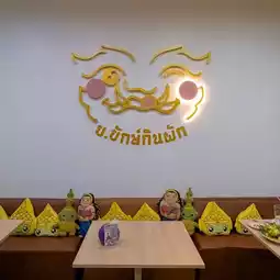 The interior is brightly decorated and has two levels of seating, both indoor and outdoor. The view overlooks the Somdej Phra Pinklao Bridge. Come in the evening for a great atmosphere, not too hot, and enjoy a relaxing meal.