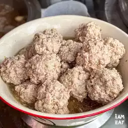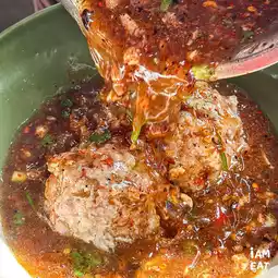 Minced pork in spicy soup for 90 baht. The minced pork chunks are incredibly juicy. Pair them with the hot tom yum soup.