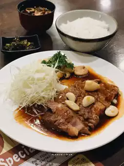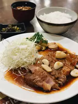 Tonteki Set (Kobe Tonteki), an original Japanese recipe featuring premium pork cutlets, sous-vide, grilled, and topped with a special sauce. Served with garlic confit (soft, creamy garlic).