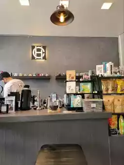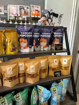 The shop also offers snacks like crispy bananas, caramel popcorn, and durian-flavored Thong Yip rolls to go with your drinks. There are two more seats at the back, a table shaped like an award-winning trophy, and a bar counter.