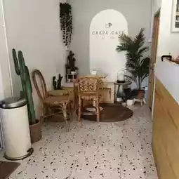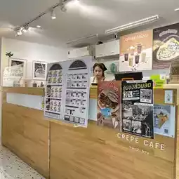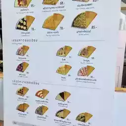 Thin-crust crepes near my home in Sammakorn Village. It's a one-room shophouse, but the interior is beautifully decorated with 3-4 tables. Outside, there's a road across from me, and a canal dug by the village. It's a great place to relax and enjoy the delicious crepes. They come in a variety of fillings, starting at 60 baht, but my favorite is the Baked Spinach and Cheese Crepe for 98 baht. The staff is quick, so you don't have to wait long. But it's best to eat them right away, as the crepes are thin and crispy, and incredibly delicious.