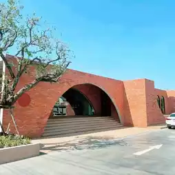 The shop boasts a unique design, featuring brickwork and curved edges, creating a striking presence. The spacious space features both indoor and outdoor areas. The shop not only serves coffee and desserts, but also serves a restaurant.