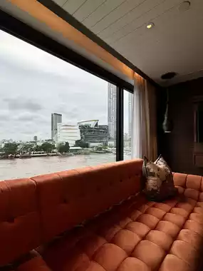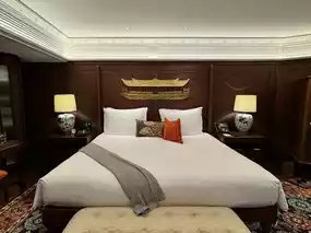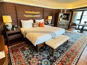 Although we've been to Thailand numerous times, we recently chose Bangkok again, eager to experience the Mandarin Oriental Bangkok for the first time. Unlike the city's newer hotels, this esteemed establishment is Thailand’s oldest, boasting nearly 150 years of history, much like The Peninsula in Hong Kong. It gracefully resides along the Chao Phraya River and is known for housing Thailand’s first elevator and maintaining a charming European-styled Authors’ Wing. Despite its central city location, the hotel offers a vast space that extends across the river, accessible by their classic private boats. This visit, we decided on the State Room, which is the largest non-suite option at the hotel. Located at the floor's corner, our room offered a stunning 270-degree panoramic view of the Chao Phraya River and Bangkok’s skyline, best enjoyed from the private balcony. The room enveloped us in traditional Thai ambiance with elements like teakwood, silk, and vintage decor. The hotel excels in hospitality. From the start of our stay, the manager presented us with orchid bracelets, reflecting the Land of Smile's symbol. While it's not near the railway, private boats conveniently connect guests to city attractions. The airport transfer service features a limousine equipped with massage chairs and TVs, ensuring a luxurious journey.