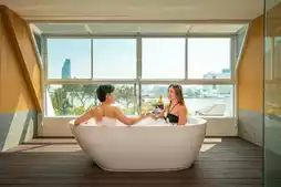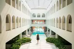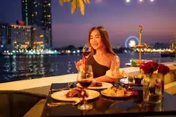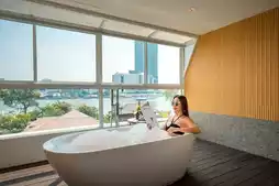 I had a delightful time at this minimalist, white hotel beside the Chao Phraya River. The peaceful ambiance and picturesque spots at every turn were lovely! I appreciated the clean design, the central pool with a glass roof, and the tranquil vibe throughout the premises. We stayed in the Away River Suite (128 sqm) that was very spacious, featuring a large balcony and a bathtub with river views. The room was cozy yet sophisticated with white hues and warm wooden furniture. It was well laid-out with separate living, sleeping, and bathroom spaces, plus all necessary amenities. One of the highlights was Sarin River Terrace, the hotel’s riverside café and restaurant. It's an ideal place to relax in the evening, take in the river views, listen to soft music, and enjoy tasty food. If you're seeking a tranquil riverside retreat near Bangkok with stunning views and a soothing atmosphere, this location is a great option!