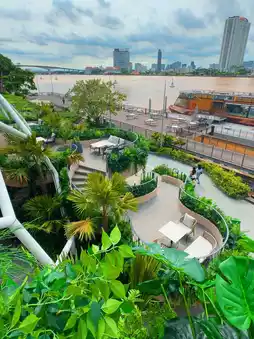 You can also visit the exhibition "Our World," featuring a two-story sitting area with a stunning view of the Chao Phraya River. There's also a flower garden and children's playground on the side.