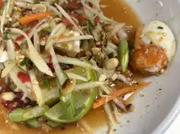 The restaurant looks like a haven for somtam lovers. There's both air-conditioned and outdoor seating. Parking can be a bit tricky, but the atmosphere is welcoming. It's a favorite spot for many people.