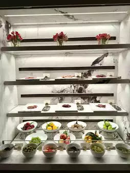 Order hot noodles or grilled dishes from the live kitchen. Grab a salad or appetizer while you're there, and finish off with a pastry and fruit for an efficient way to enjoy the entire menu.