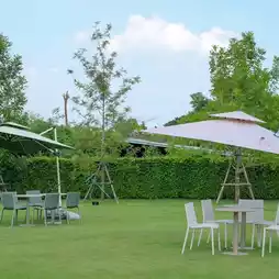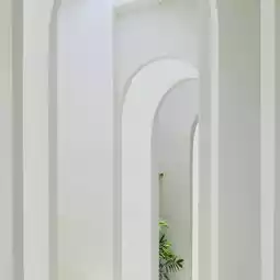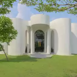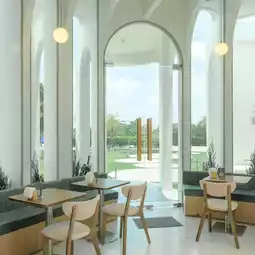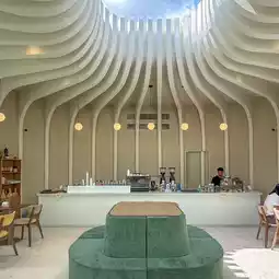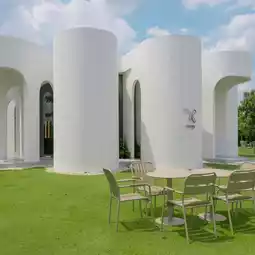 The highlight of this place is its homey decor, incorporating a curved structure, inspired by the curves. This creates a soft, airy atmosphere. The clean white tones and natural light make for a beautiful photo opportunity from any angle, whether in the morning, afternoon, or evening. The outdoor area is surrounded by a spacious lawn, creating a homely garden feel. It's perfect for chilling out and enjoying the cool evening breeze. And what's more, the outdoor area is also pet-friendly, perfect for animal lovers.