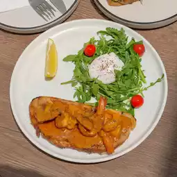 🦐 Creamy Shrimp Toast with a Touch of Spice: Sourdough with a crispy exterior and soft interior, topped with a deliciously savory sauce with a hint of spice and a light herb aroma. It's topped with large, mouth-watering shrimps, served with rocket salad and a poached egg.