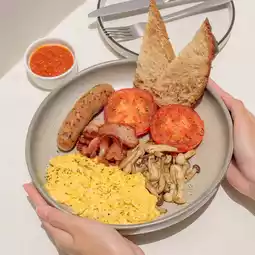 🍳 Breakfast Set: This generous portion is a must-try for hungry guests. The set includes scrambled eggs, sausage, bacon, sourdough, grilled tomatoes, and grilled mushrooms, all served with the restaurant's special sauce.