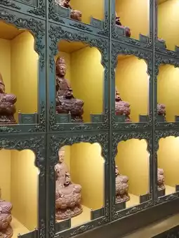 🌿Entering the temple grounds, you'll find four beautiful golden Guanyin statues standing with their backs to each other. The walls are adorned with statues of Chinese deities, creating a mystical and enchanting atmosphere.