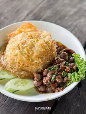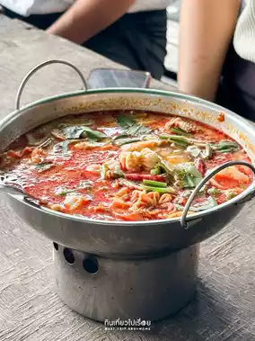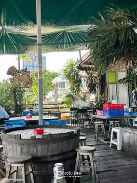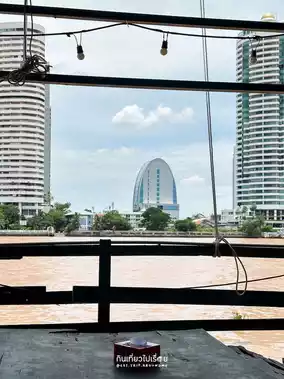 #GetDiscountsWithoutLuck When we think of Sriyan, we often think of traditional shophouses and street food. But this time, we'll take you to the other side of the Chao Phraya River. Drive down the road, turn left, and follow the narrower alley until you reach the end. You'll see a shrine. Yes, you can park there and walk to the restaurant. The entrance isn't prominent, but the interior is quite spacious. It's like a floating raft on the water, with wooden tables and a retro atmosphere.