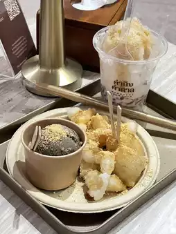 - Signature Kham Nueng Kham Tan (140 baht): These crispy, mochi-like fried dough sticks are incredibly delicious! 10/10! Crispy on the outside and chewy on the inside. The shop fries them perfectly, without being greasy at all. Topped with palm sugar sauce and crumble, they go perfectly with the rich hojicha ice cream. I personally love it so much I recommend everyone to try it!