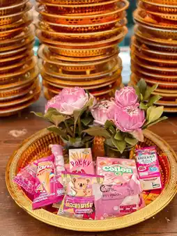 Bright colors, especially pink, and various offerings.
