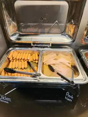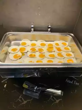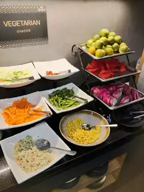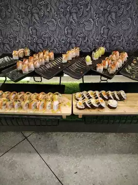 The hotel is excellent! It's very close to the airport. The breakfast restaurant is superb, offering sushi and salmon. The food is incredibly delicious, and there's also a cocktail bar where you can order drinks. The bar even has a pool table! The staff at the counter are polite and courteous, and there's a porter to help with your luggage right at the entrance. I only took pictures of the food to show you, not the room—I forgot! But the room is fantastic, very spacious, and overall great.