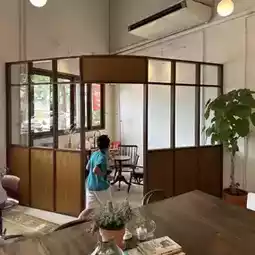 Minimalist decor with wood and white tones, featuring beautiful photo spots 📸. Indoor seating is cool and comfortable, while outdoor seating lets you enjoy the natural breeze 🌞. Equipped with Wi-Fi and power outlets.