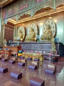 Wat Fo Guang Shan is a temple modeled after a Taiwanese temple. The art and sacred objects within the temple are exquisite, reflecting Taiwanese art. The grand and beautiful main hall enshrines three golden Buddha statues, offering blessings of good fortune and safety. The side walls are intricately carved with the exquisite and magnificent image of the Goddess of Mercy, Guanyin.