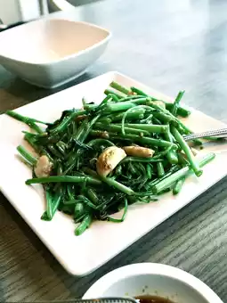 The stir-fried water spinach boasts the aroma of garlic and chili peppers and a satisfying crunch.