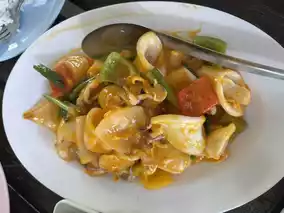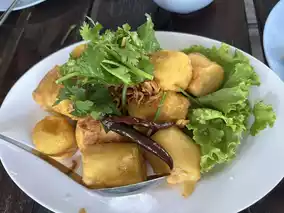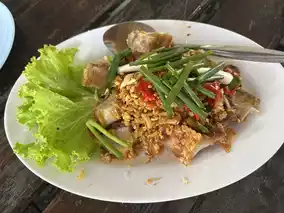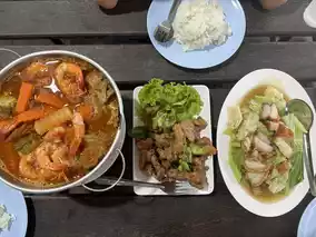 😍 Signature dishes include pork with lime, sour curry with shrimp and acacia flowers, fried tofu with fish sauce, fried catfish cakes, stir-fried mussels, creamy tom yum goong, and grilled pork neck salad.