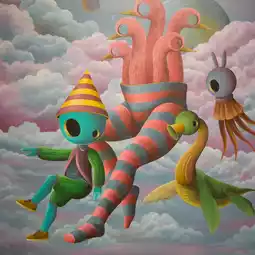 🎨 Susiyo (Indonesia) uses pop-surrealist works filled with symbols such as mojo-headed children, bizarre creatures, and objects that come to life, depicting local beliefs, faith, and Indonesian political history, inviting viewers into a world of freedom and the contradictions between reality and dreams.