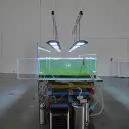 Prachaya Pinthong, a conceptual artist, often challenges viewers to look beyond physical objects and explore their underlying meanings. Using process and real situations as the primary medium for questioning social issues, he uses demolition and reconstruction through his work /|~~~~~~~~~~~~~~~~~~||/| (2025), a glass aquarium-like enclosure constructed from the dismantling of the gallery's door and window panels. Concrete cushions from a parking lot serve as the base of the enclosure. Inside, we find a temporary house-like structure submerged in a glass aquarium perched atop a grassy field. This structure may reflect instability, fragility, and the struggle for survival, but it also opens up new interpretations from the viewer's perspective.
