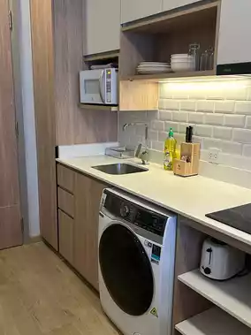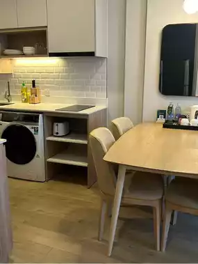 The rooms are serviced apartment-style with washing machines and kitchens, making them ideal for long-term stays.