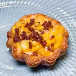 The Sweet Corn and Bacon Tart is a croissant tart made with real French butter and filled with corn cream and sprinkled with bacon.
