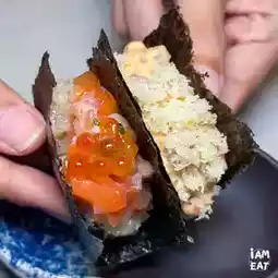 Salmon and Hamachi with Larb Sauce Hand Roll, featuring diced salmon and hamachi tossed in Larb Sauce for a fragrant and spicy Thai flavor. Absolutely delicious!