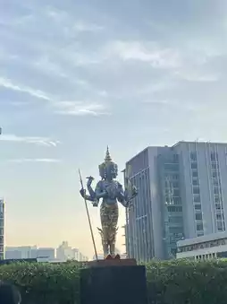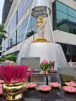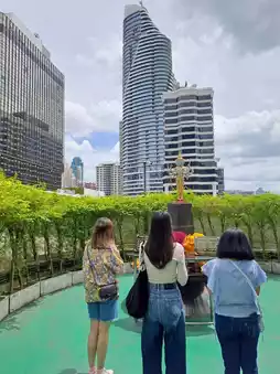 The vibe is actually amazing though—peaceful yet right in the middle of Bangkok’s skyscrapers. With lotus offerings and incense, it feels like “urban spiritual chic” 🏙️🌸