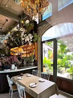 B Story Cafe's distinctive design combines vintage and European influences. The building resembles a large glasshouse, surrounded by trees, flowers, and decorative objects, creating a warm and romantic atmosphere. The interior features a variety of wooden furniture, including antique chairs, carved wooden tables, and handmade decorations, adding liveliness to every corner. There are photo opportunities everywhere, from the mirrors, windows, and the outdoor garden, making this cafe a favorite among photography enthusiasts.