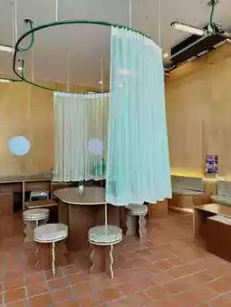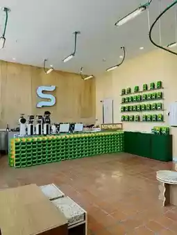 The interior is spacious, with plenty of seating. The seats are made of foam, and the shop is decorated with clear plastic, creating a unique look. The counter is decorated with beautiful green plastic crates.