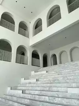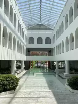 The pool area is just as pictured. The lighting is beautiful and the colors are beautiful. I love the white theme throughout the hotel. The walkways are lined with trees and shadows, perfect for taking photos. Some corners are decorated with pictures, giving it a gallery-like feel.