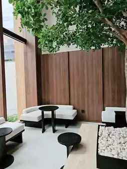The shop itself is beautiful and charming. Although small, it's well-designed and offers ample seating. Most seating is shared, with no large tables. The center of the shop is lined with trees, and the surrounding area is also designed for seating.