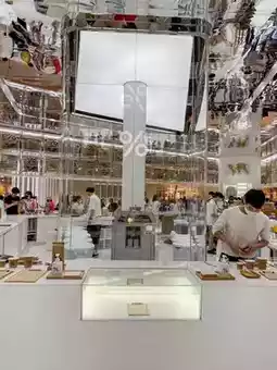 The shop is surrounded by glass. You have to wait in line to buy drinks
