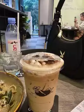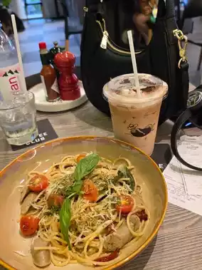 I ordered a plate of spaghetti, an iced cappuccino, and a bottle of water. I ate it all by myself and it was delicious. The hunger made it even better. The atmosphere is relaxed and perfect for work or gossip. Since I was alone, I didn't know who to talk to.