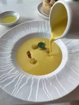 The lunch course was perfectly curated, starting with appetizers to awaken the palate for the main dishes. The Tomato Orzotto and Crispy Skin Seabass with Orange Flavored Fennel were cooked to perfection, served alongside meticulously plated sides. The meal concluded with a European-style dessert, Pavlova, which was sweet but not overly so, offering a refreshing finish. Each dish was not only delicious but also a work of art in its presentation.