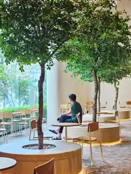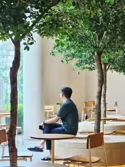 Upon entering the cafe, you'll find a very spacious space with plenty of tables. You'll definitely find a place to sit if you come. The interior is beautifully decorated, with artificial greenery and a minimalist feel. There's also a glass seating area with a view outside.