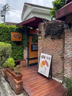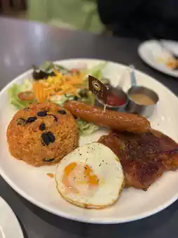The food is easy to eat and suitable for all ages. They often have promotions. Our recommended dish is the Kurobuta pork steak with black pepper. The pork is high-quality and tender, with the black pepper marinated in the meat. It comes with side dishes like French fries, mashed potatoes, and a vegetable salad. They also have a special promotion on the Space Chicken Steak, which is often delicious. This time, I tried the Santa Fe American Fried Rice. The fried rice was flavorful, and the Space Chicken Steak was mildly spicy. The Kurobuta sausage and the perfectly cooked egg were delicious. They also have other dishes like ham and mushroom spaghetti and truffle soup. We ate at the The Mall Ngamwongwan branch on the 5th floor and it's open from 11:00 AM to 10:00 PM.