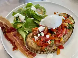 I recommend the Breakfast Board: smoked ham, marinated salmon, avocado, sourdough bread, and tomato salsa. The portions are quite large for the price. They also have drinks, wine, and sparkling wine.