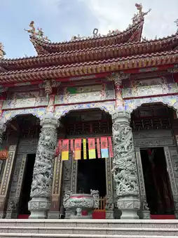 🧱 The front and back of the ordination hall have porches extending outward, with lion-shaped bases supporting the structure. The Buddhist sanctuary area is enclosed by a decorative wall, with small, square-based stupas at each of the four corners.