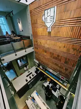There are seating areas on the first and second floors. The second floor has window seats, and a large, comfortable table in the center.