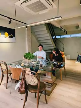 The shop is located on the roadside in a commercial building. It may seem small from the outside, but once you step inside, it's open and airy, with high ceilings and three floors. The walls behind the bar counter are decorated with brown bricks, giving it an Ayutthaya feel.