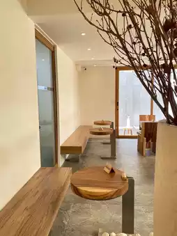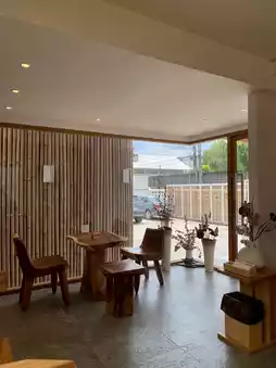 🛋️ The cafe's interior is decorated in warm, simple tones, with small tables for working and a seating area for relaxing. The photos look lovely and soothing to the eyes.